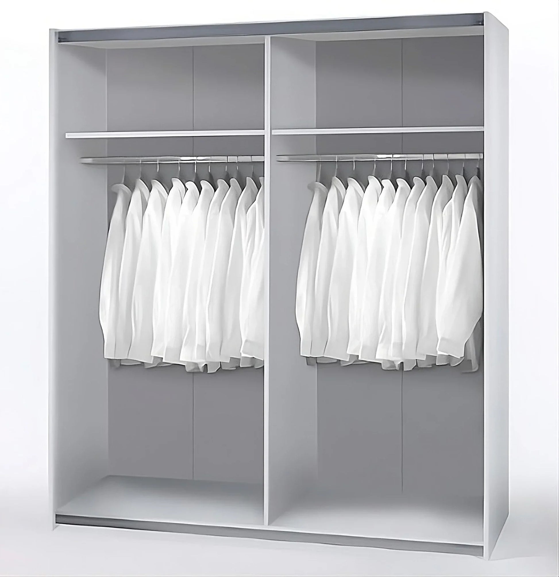 - Internal layout: Two sliding doors, one shelf and two hanging rails for organized clothing storage