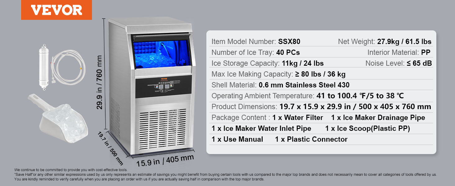 VEVOR Commercial Ice Maker 110lbs/24H 60 Ice Cubes in 12-15 Minutes 33lbs Storage Capacity LED Digital Display