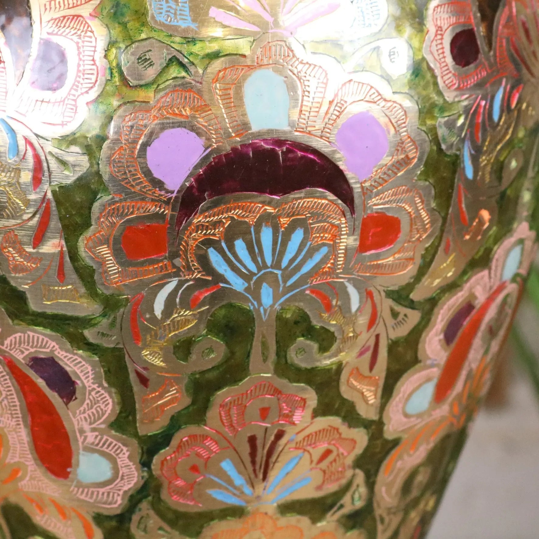 Make a bold statement with this large brass vase, a beautifully preserved vintage piece standing at an impressive 92cm tall. Handcrafted in India approximately 20–30 years ago, it features vibrant pink and green floral motifs, delicately etched and painted by skilled artisans. The detailed craftsmanship and rich enamel colours make this vase a stunning example of traditional Indian metalwork.