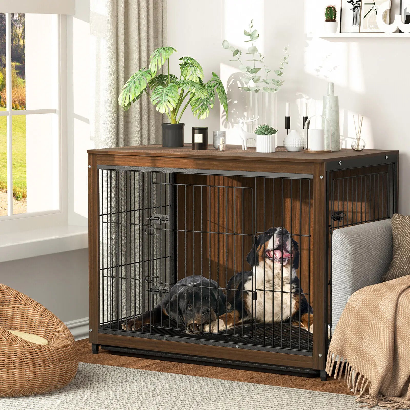 Wooden and Metal Pet Cage, Dog Crate, End Table Furniture, Double Doors, Removable Tray, Cage, Kennel House, 25 in, 32 in, 39 in