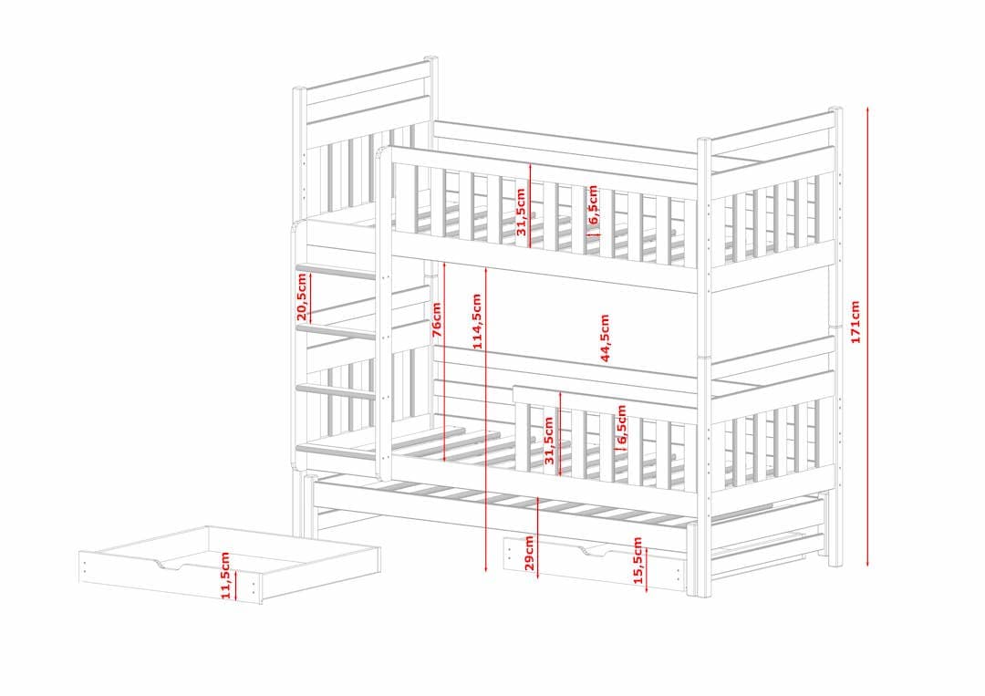 The Klara bunk bed with trundle and two storage drawers is space-friendly and a practical choice of furniture for your home. It provides a secure and comfortable sleeping area, protected by tall guard rails on both the upper and lower beds. The ladder is universal and can be attached at either side of the bed.