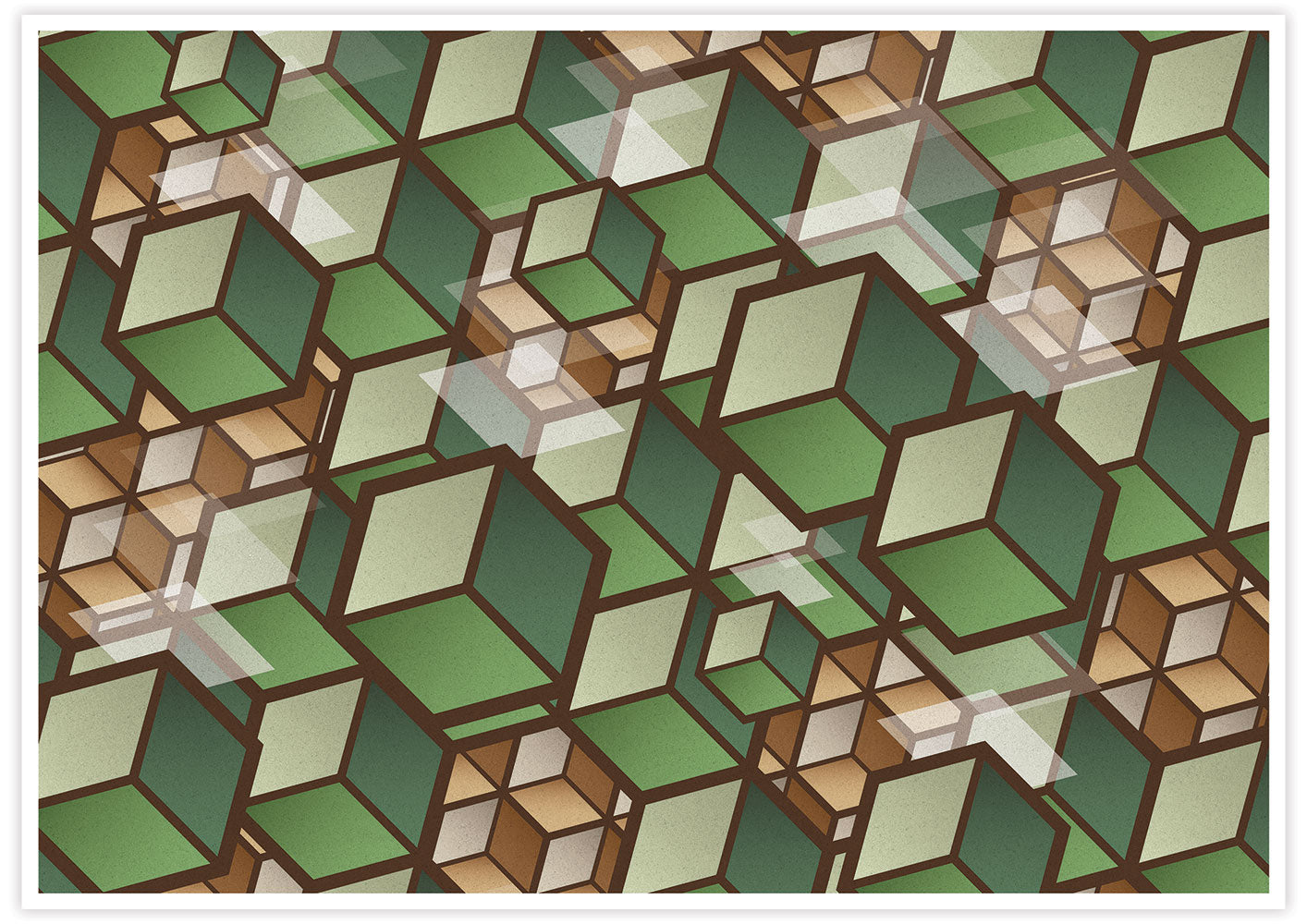 Woodland Cubes is inspired by the colours of woodlands and forests. With Strong greens against subtle browns, infused with a cube pattern will make you look twice at its surprising complexity.