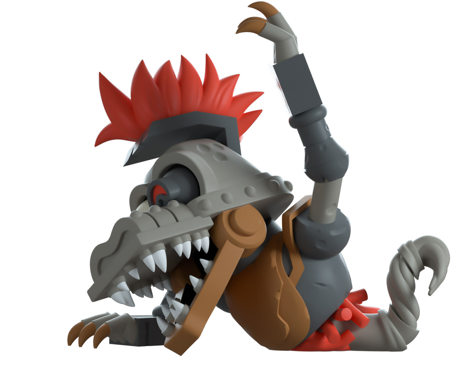Pulling himself along with a clawed hand as he scrambles forward at 3.6 inches tall, Monty raises an cold metallic arm upwards past his red mohawk as his bare face sits above an open mouth full of sharp teeth. With a glowing red eye shining from his vacant left socket, red wires fall out from his exposed chest as what remains of his spine and legs twist and curl around behind him. The exterior of his packaging shows Monty’s head emerging from the water of a flooded basement while the interior is printed with the neon ‘Security breach’ logo and covered in checkered blue and black pattern which works its way onto the protective sleeve as his figure can be seen through the large clear display window at its front. This collectible ships in a matte, embossed, protective outer sleeve and a custom-sized plastic protector for maximum protection during shipping.