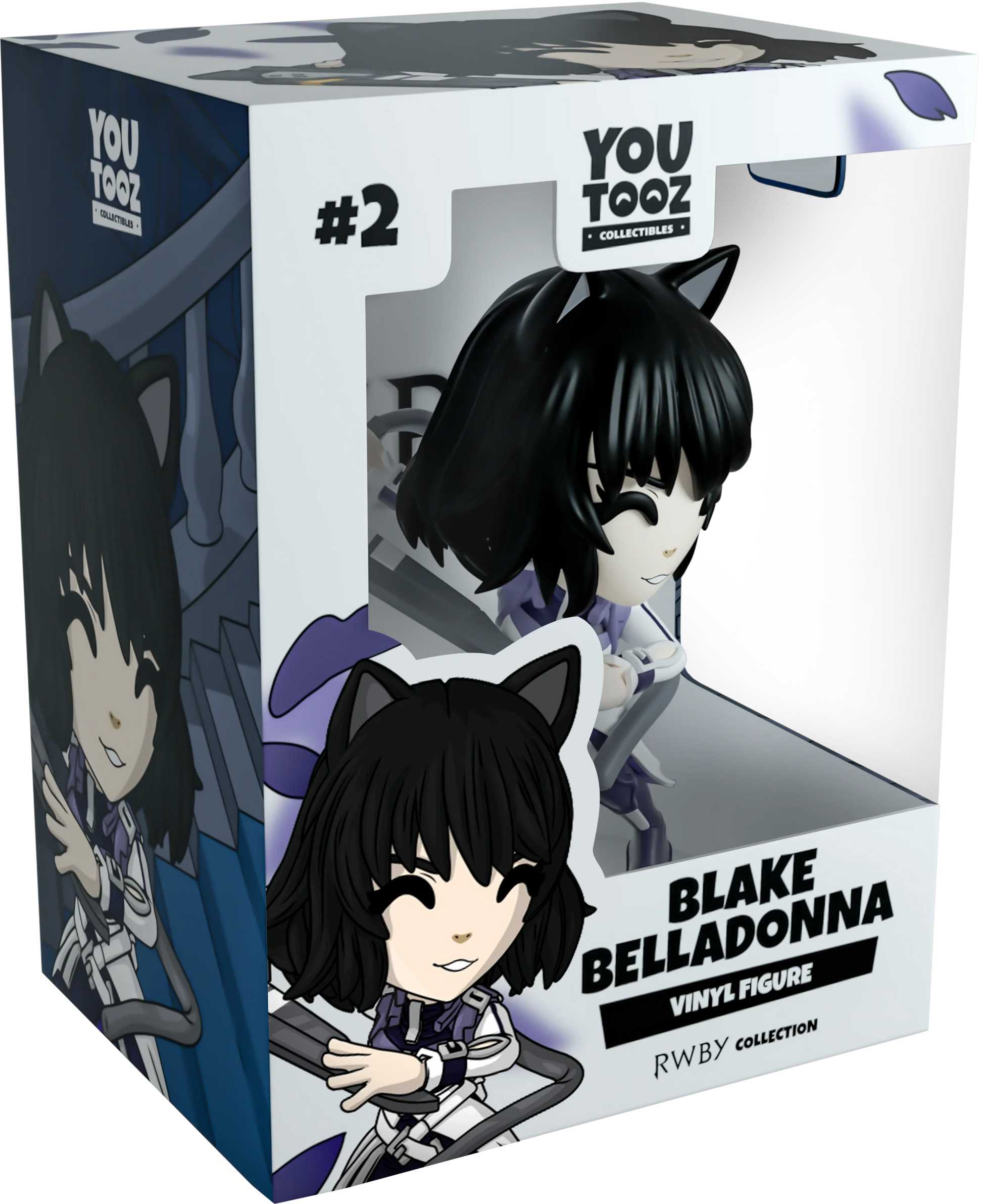 The B of RWBY arrives to Youtooz! Standing at 4.5 inches, Blake is ready to fight. She is wearing her long white jacket with her one piece navy bodysuit underneath. Her dark black hair falls just above her shoulders with her cat ears perking up from the top of her head. She is posed in an action fighting manner and is using both hands to wield her weapon of choice, the Gambol Shroud. The exterior of her double-walled packaging shows the inside of a dark mansion during the night, with Blake standing on a large staircase. The interior is a white background with violet flower petals drifting and floating around the scene. This collectible ships in a matte, embossed, protective outer sleeve and a custom sized plastic protector for maximum protection during shipping.
